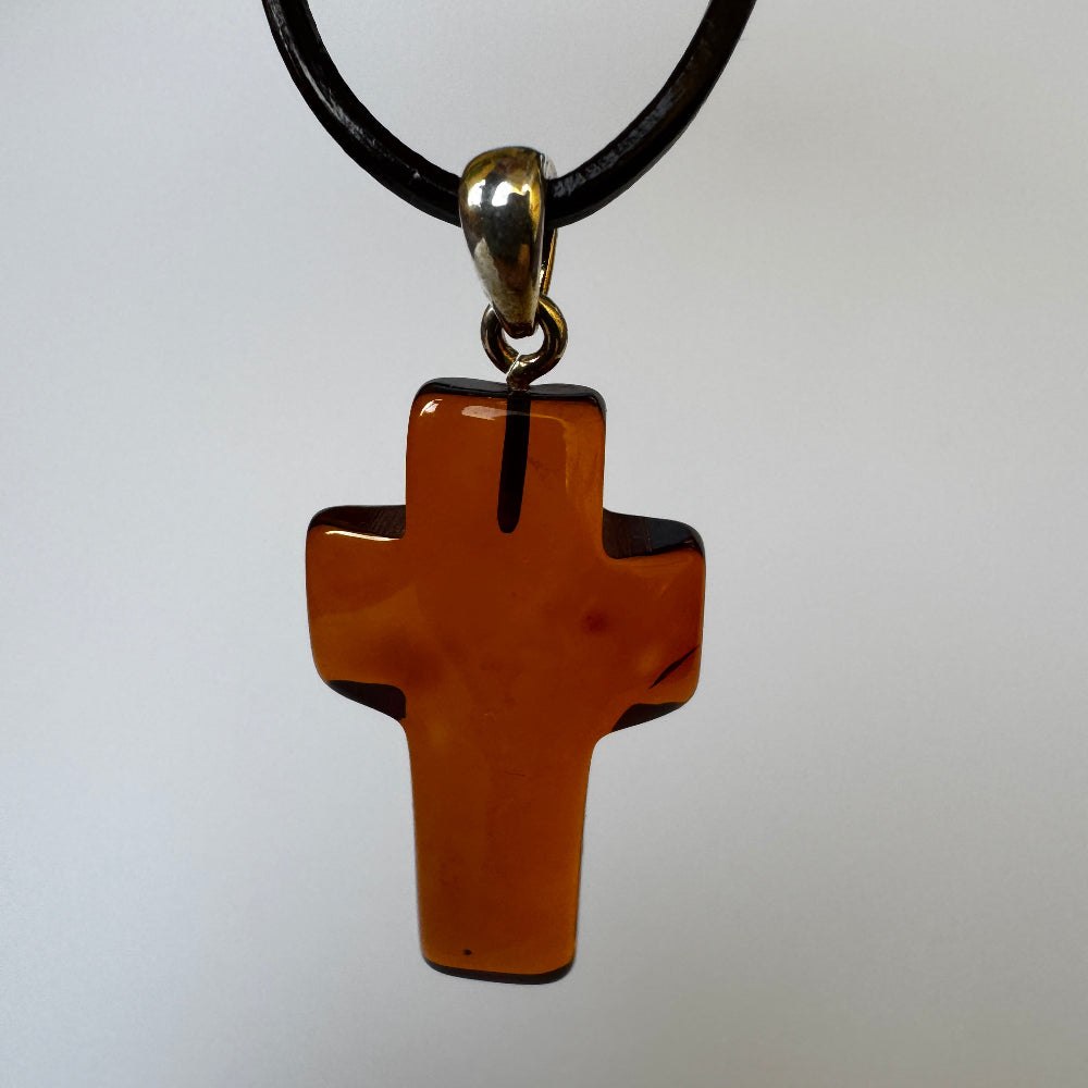 Bernstein-Kreuzanhänger aus echtem Naturbernstein in warmen Gold- und Honigtönen. Jedes Stück ist ein Unikat mit individueller Struktur. Symbolträchtiges Design, angenehm leicht zu tragen und ideal als Geschenk zu religiösen Anlässen oder als persönlicher Glücksbringer.