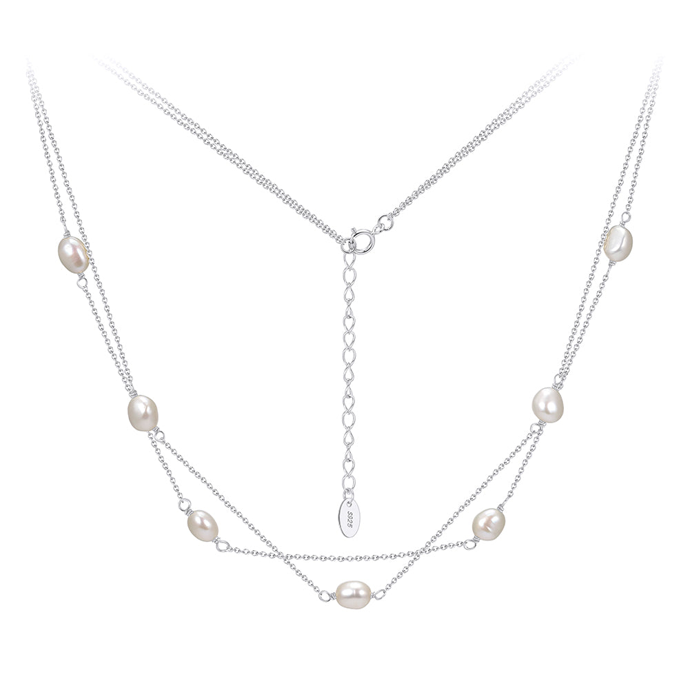 Diese feine Perlenkette aus 925er Sterlingsilber vereint klassische Eleganz mit modernem Design. Zarte, natürlich schimmernde Süßwasserperlen sind harmonisch in eine filigrane Kette eingearbeitet und verleihen dem Schmuckstück eine edle, feminine Ausstrahlung. Die doppelte Kettenführung sorgt für einen besonderen Layering-Effekt und macht die Kette zu einem stilvollen Blickfang – sowohl im Alltag als auch zu besonderen Anlässen.